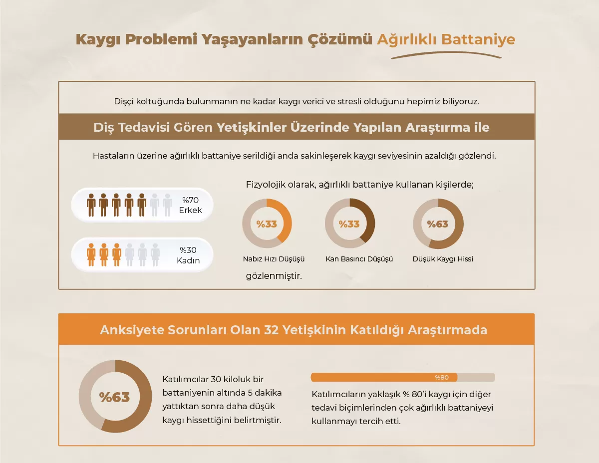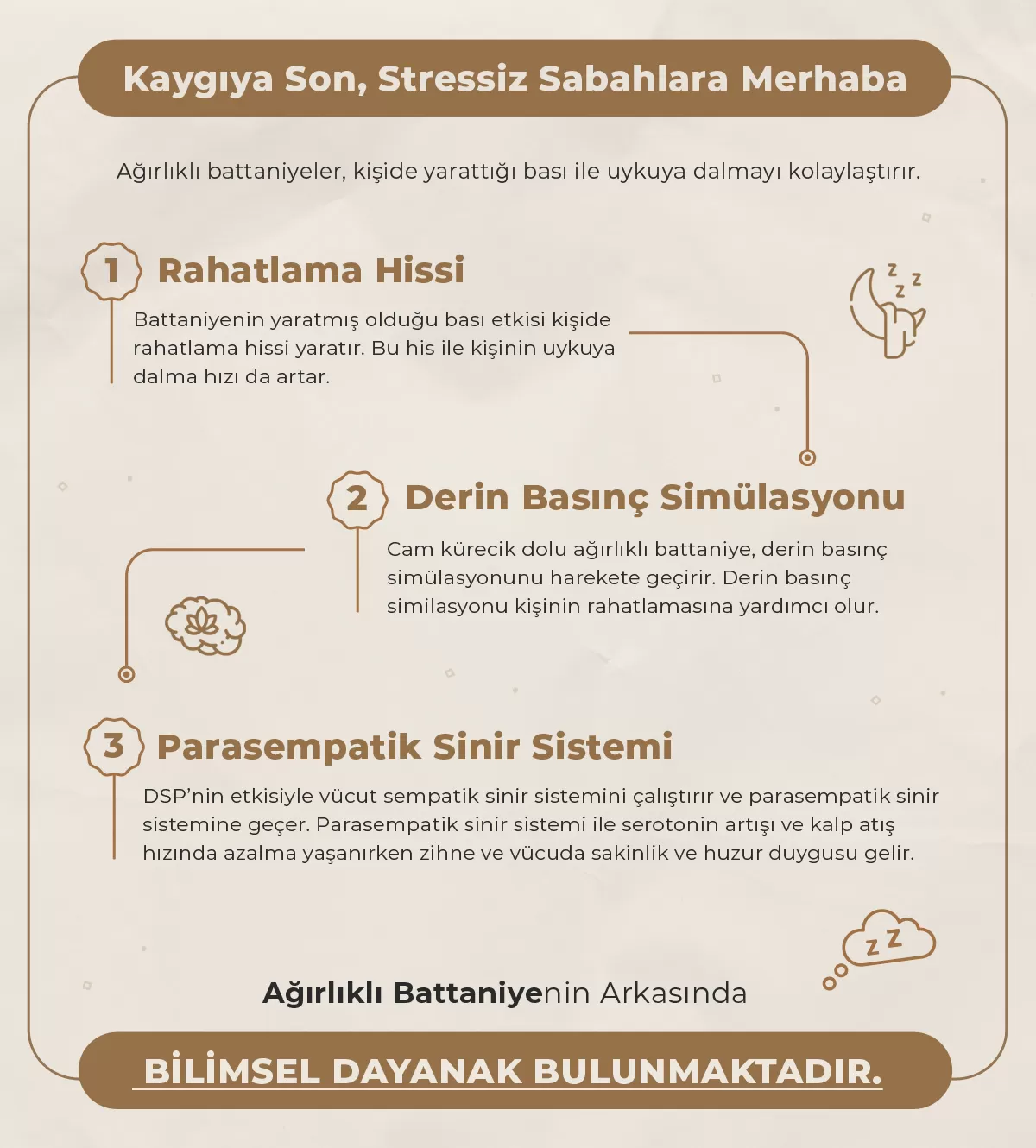 Ağırlıklı battaniyelerin baskısı nefes alma, sindirim, terleme ve titreme gibi temel bedensel işlevleri kontrol eden otonom sinir sisteminizi "dinlenme" moduna sokarak, kalp atış hızının artması veya nefes alma gibi bazı kaygı semptomlarını azaltır. Ayrıca serotonin hormonunun artmasına olanak tanır. Serotonin hormonu kan basıncını, kalp atış hızını, kaygıyı azaltmak ve ruh halini düzenlemede yardımcıdır. Ağırlıklı battaniye serotonin hormonunun artmasına olanak tanırken, vücuttaki stres seviyesini arttıran kortizol hormonun da azalmasına yardımcı olur. Bu da kişide sakinlik hissi vererek, kaygı ve stres problemlerinizi ortadan kaldırır böylece sosyal yaşamınıza daha çok adapte olabilir ve daha iyi bir yaşam kalitesine sahip olabilirsiniz.